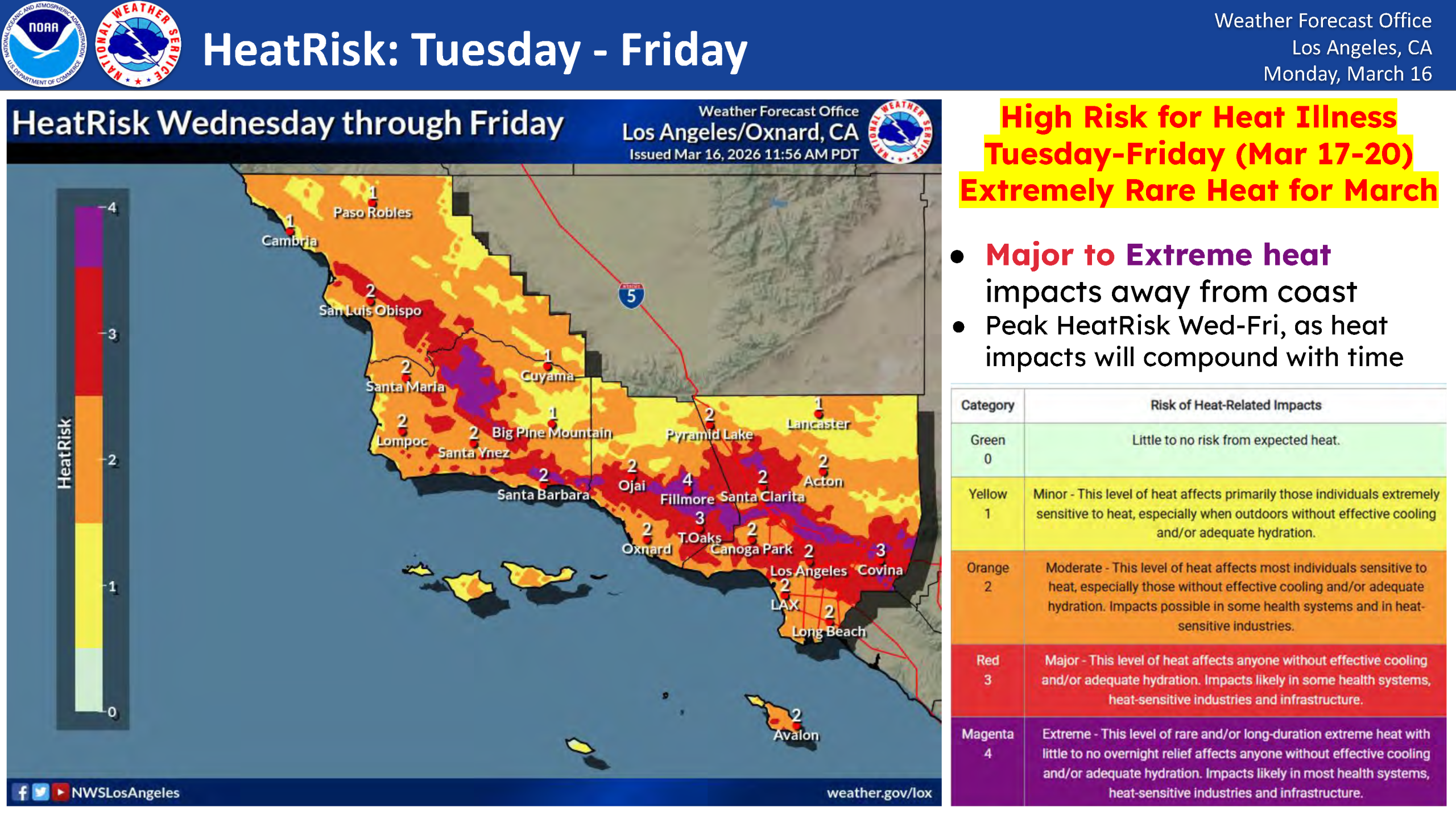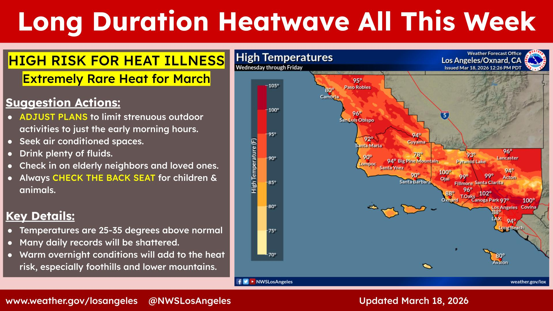 Heat Advisories and Extreme Heat Warnings will remain in effect through Friday, March 20th, as unseasonably warm weather continues to impact Ventura County. Areas away from the coast may experience temperatures in the 90s and 100s, with little overnight relief.